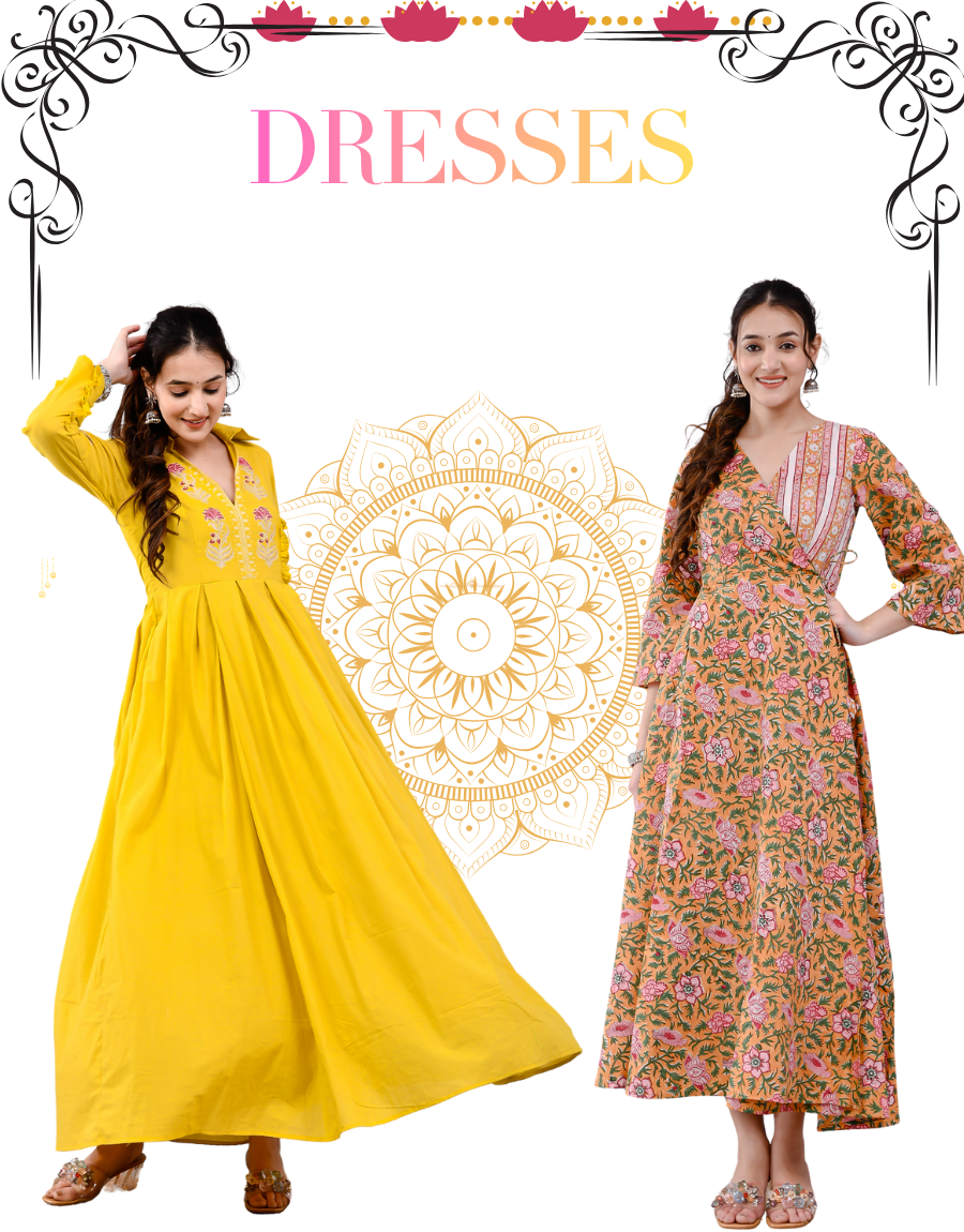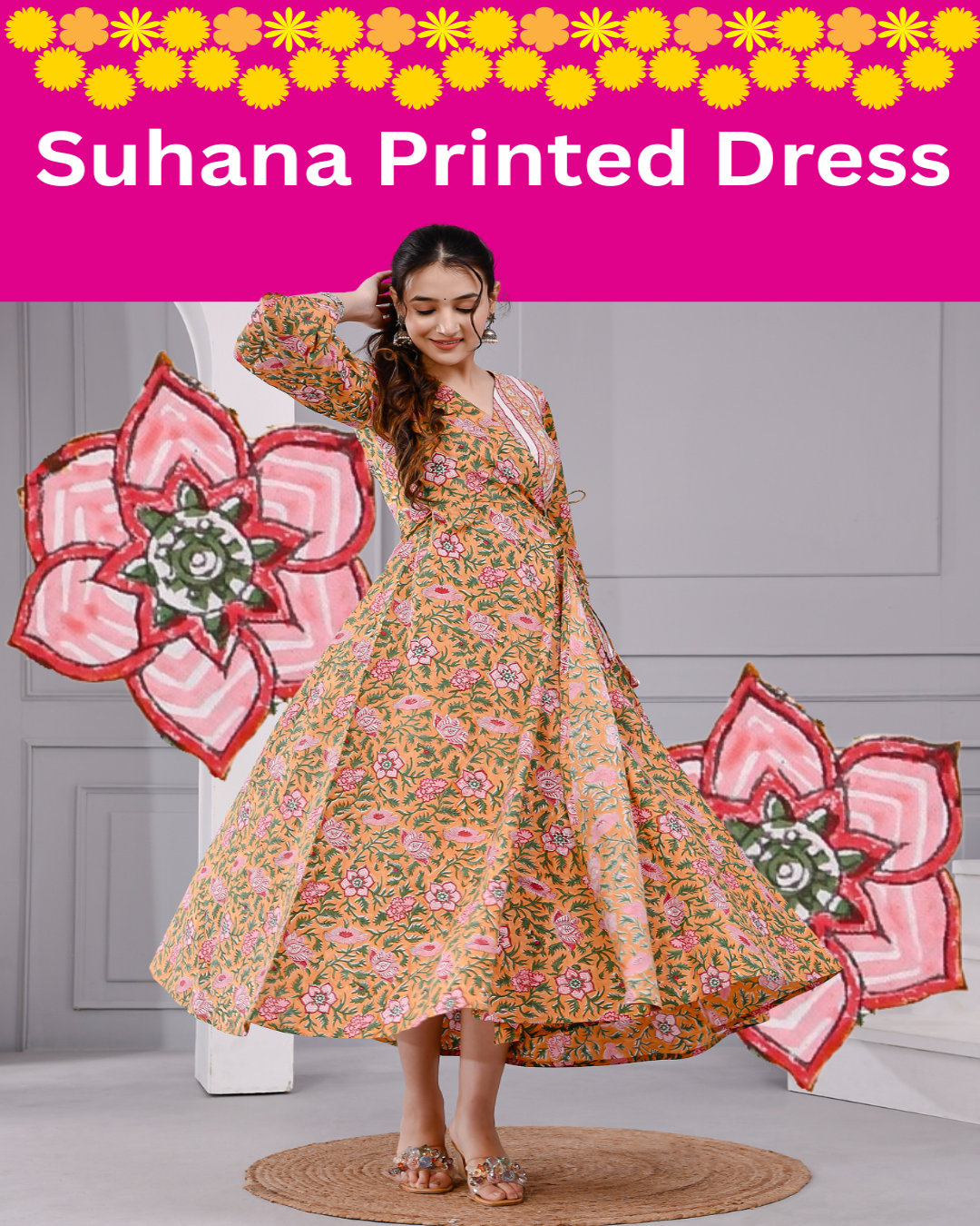 Regular price Rs. 2,499.00Regular priceUnit price / perRs. 2,999.00Sale price Rs. 2,499.00Saanvi Yellow Floral Printed Cotton Dress Set