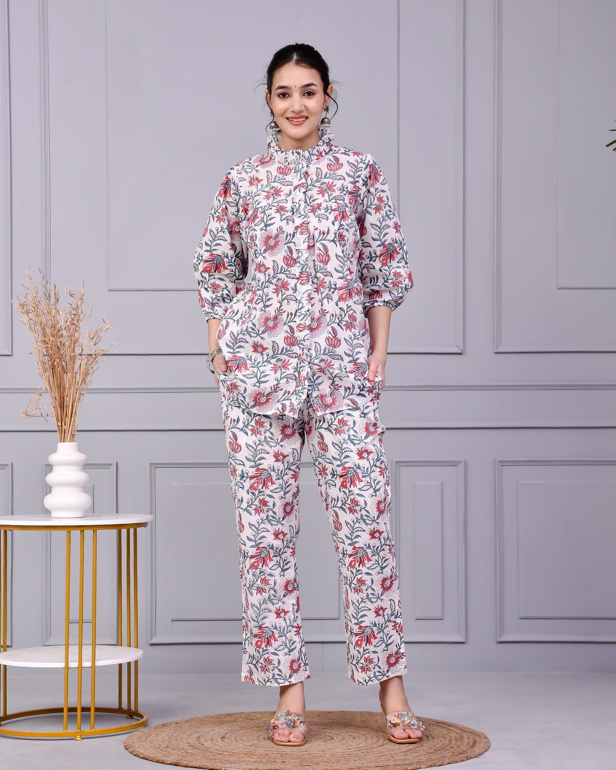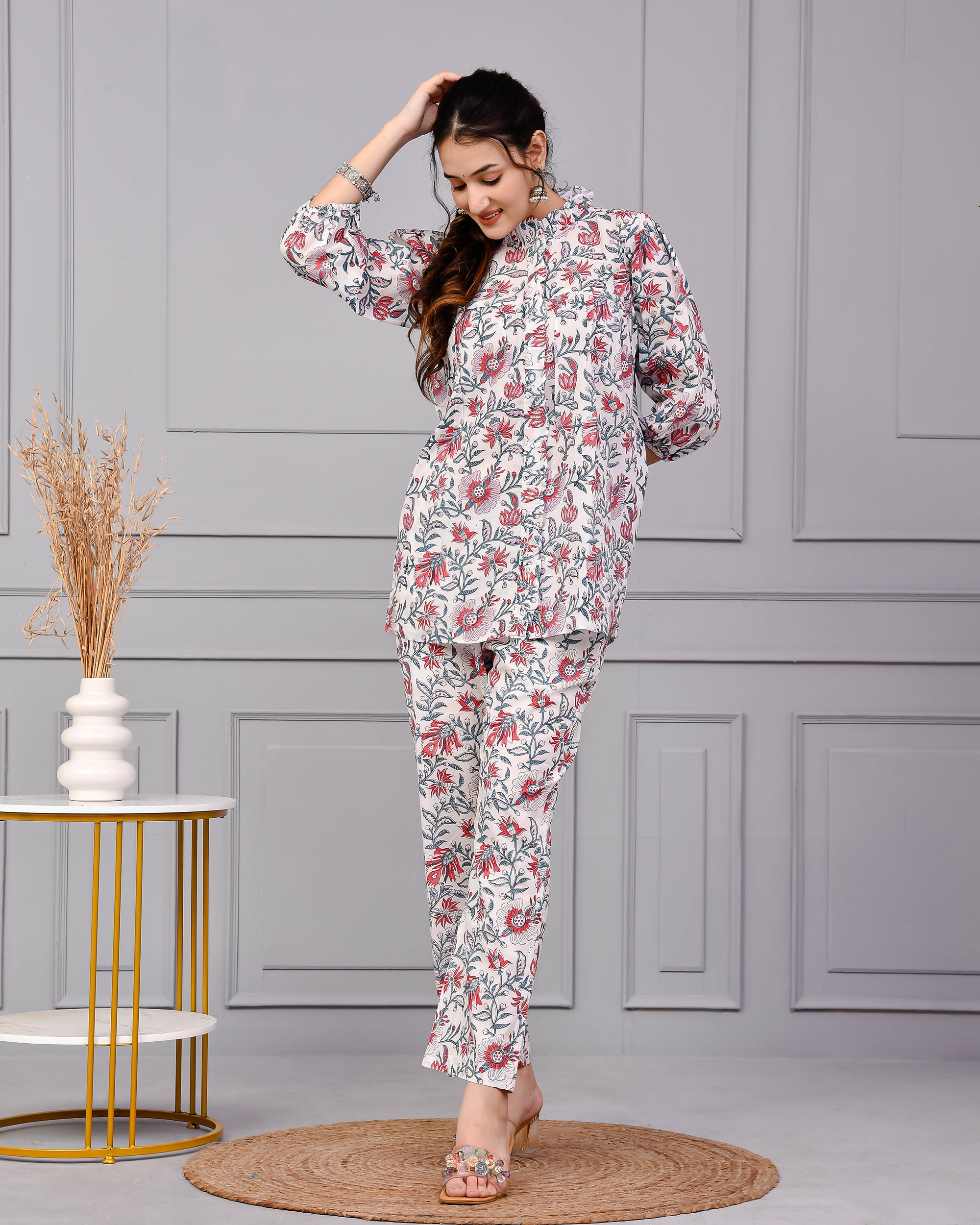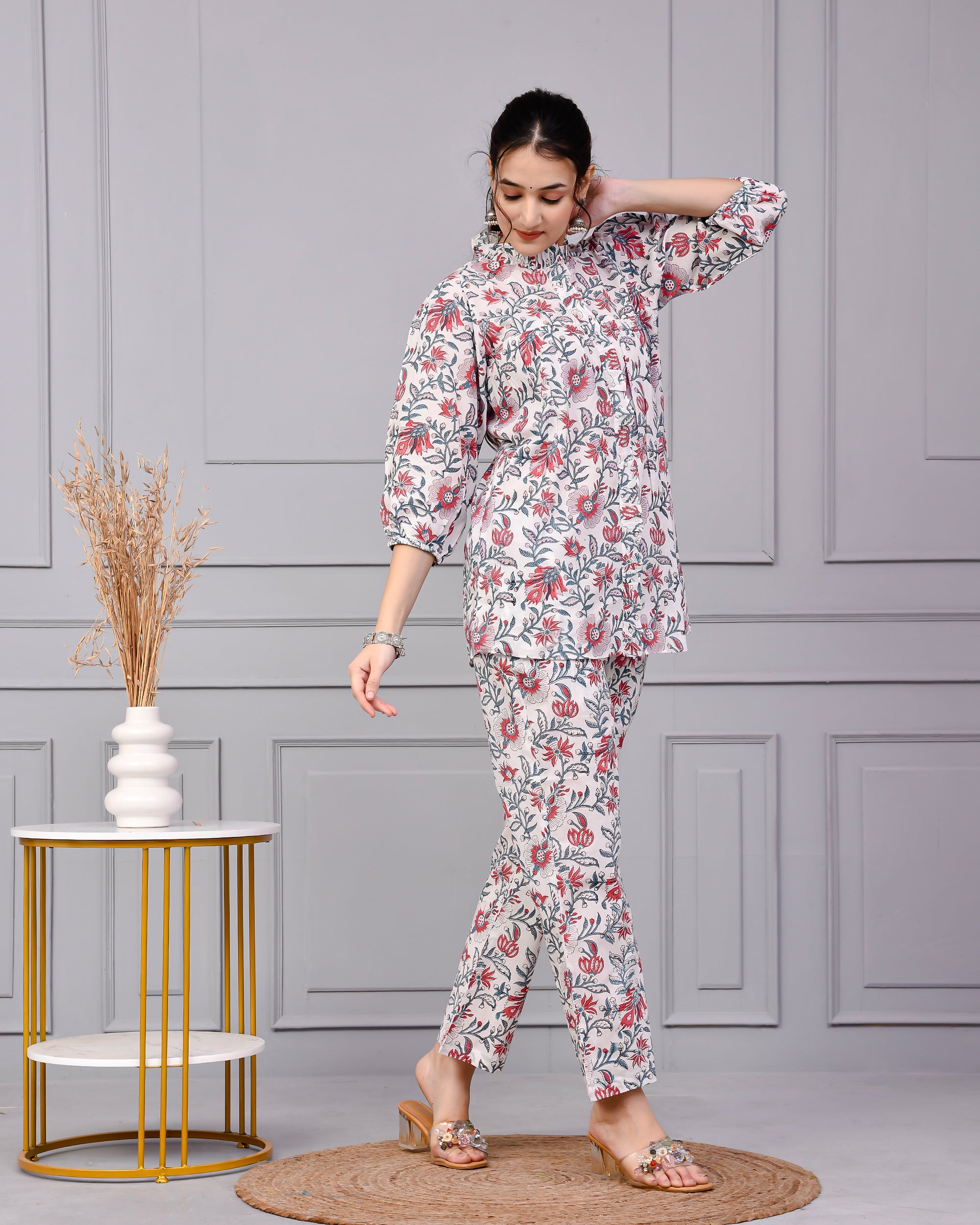 Embrace effortless elegance with our White Hand Block Printed Cotton Kurta Set for Women, a timeless floral co-ord set that celebrates heritage craftsmanship with modern grace. Crafted in breathable cotton and adorned with delicate red and grey floral block prints, this two-piece outfit is perfect for daily wear, work, casual outings, or festive day events.