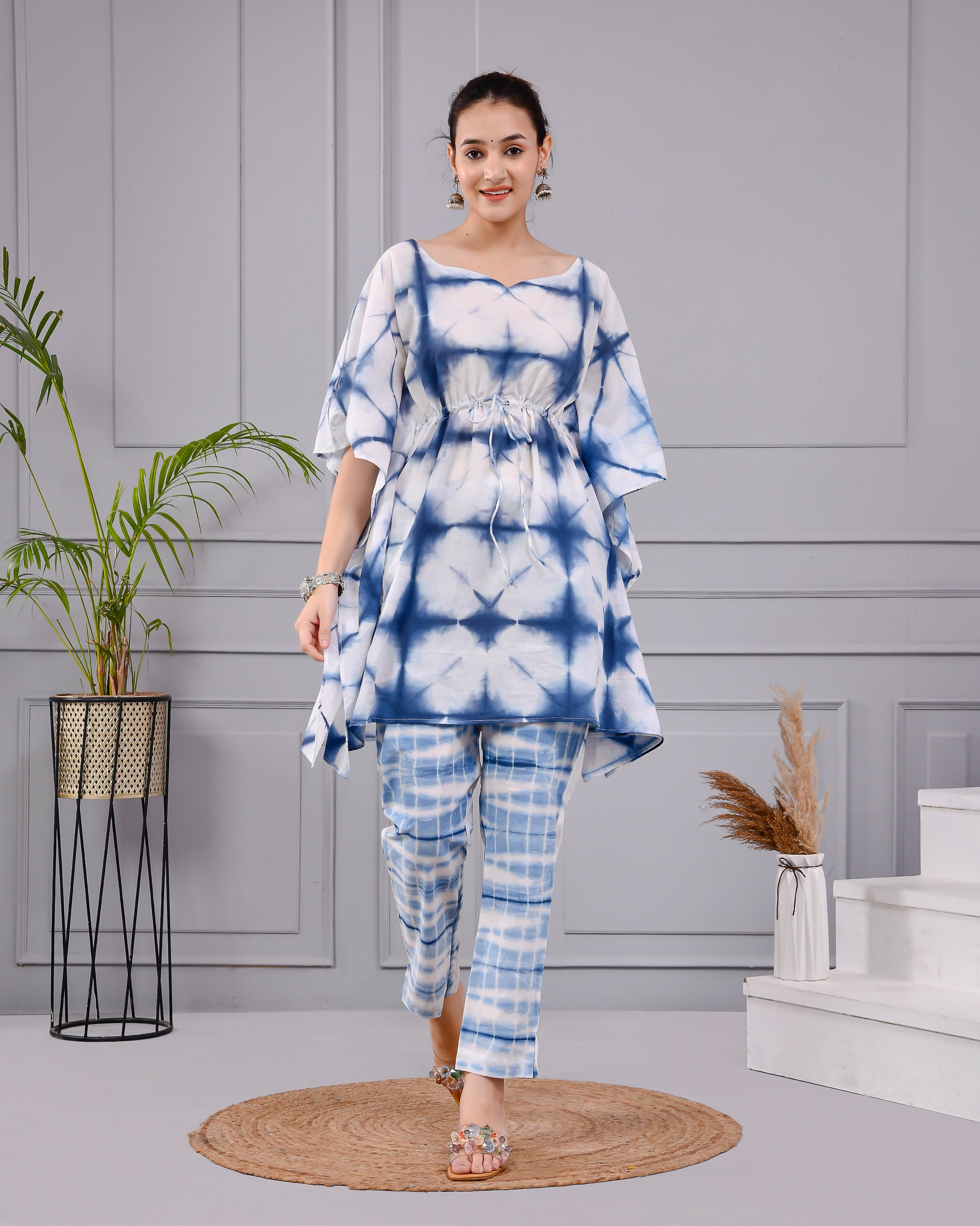 Step into relaxed elegance with this trendy blue and white tie-dye cotton dress for women, featuring a breezy kaftan-style top and matching pants. Designed in soft, breathable cotton, this dress set is perfect for summer days, casual outings, or lounging in style.