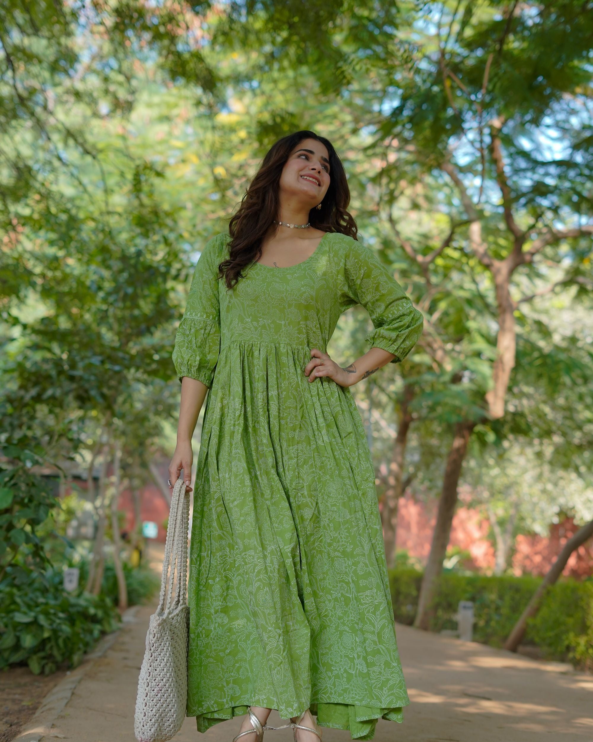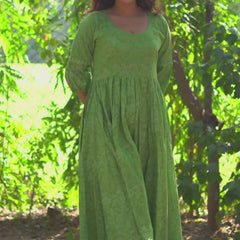 Bring home timeless handcrafted beauty with our pure cotton handblock khari print dress by Chhaape. Made from soft, breathable cotton, this green dress carries delicate metallic khari work — giving it a subtle festive glow.