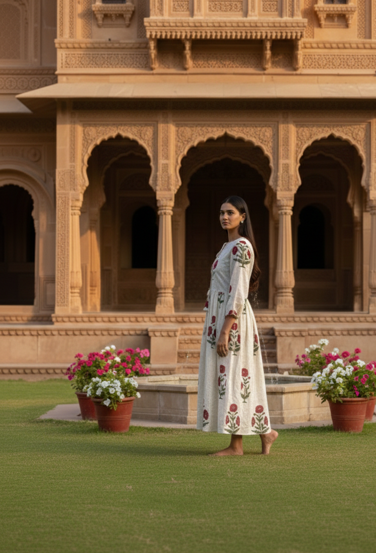 Add timeless charm to your wardrobe with this Red Floral Handblock Printed Cotton Dress, handmade by skilled artisans in Jaipur. Featuring bold red floral motifs with green leaves on a soft beige base, this maxi dress beautifully blends traditional block printing with modern boho elegance.