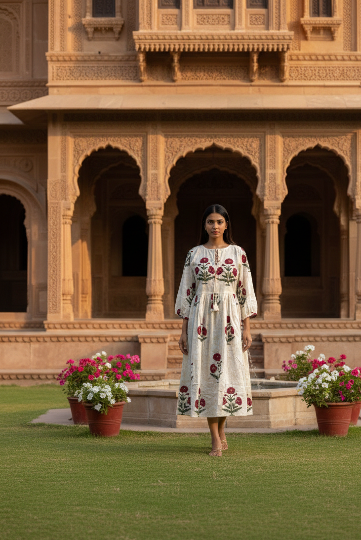Crafted from 100% breathable cotton, this dress is lightweight, skin-friendly, and designed to keep you comfortable all day long. Sustainable and eco-conscious, it’s a piece of slow fashion that supports artisan communities.