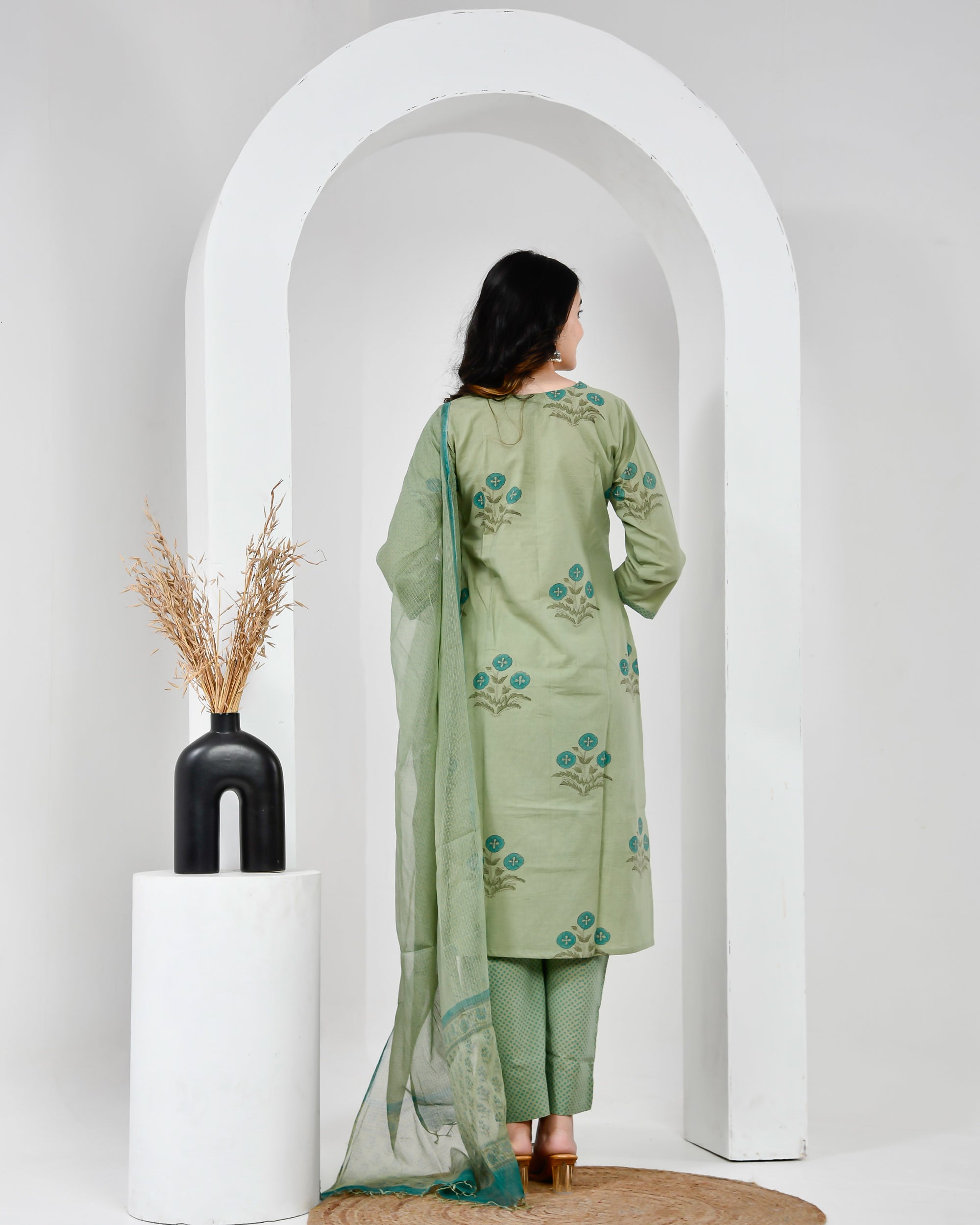 Aabroo Green Cotton Suit Set with Mulmul dupatta