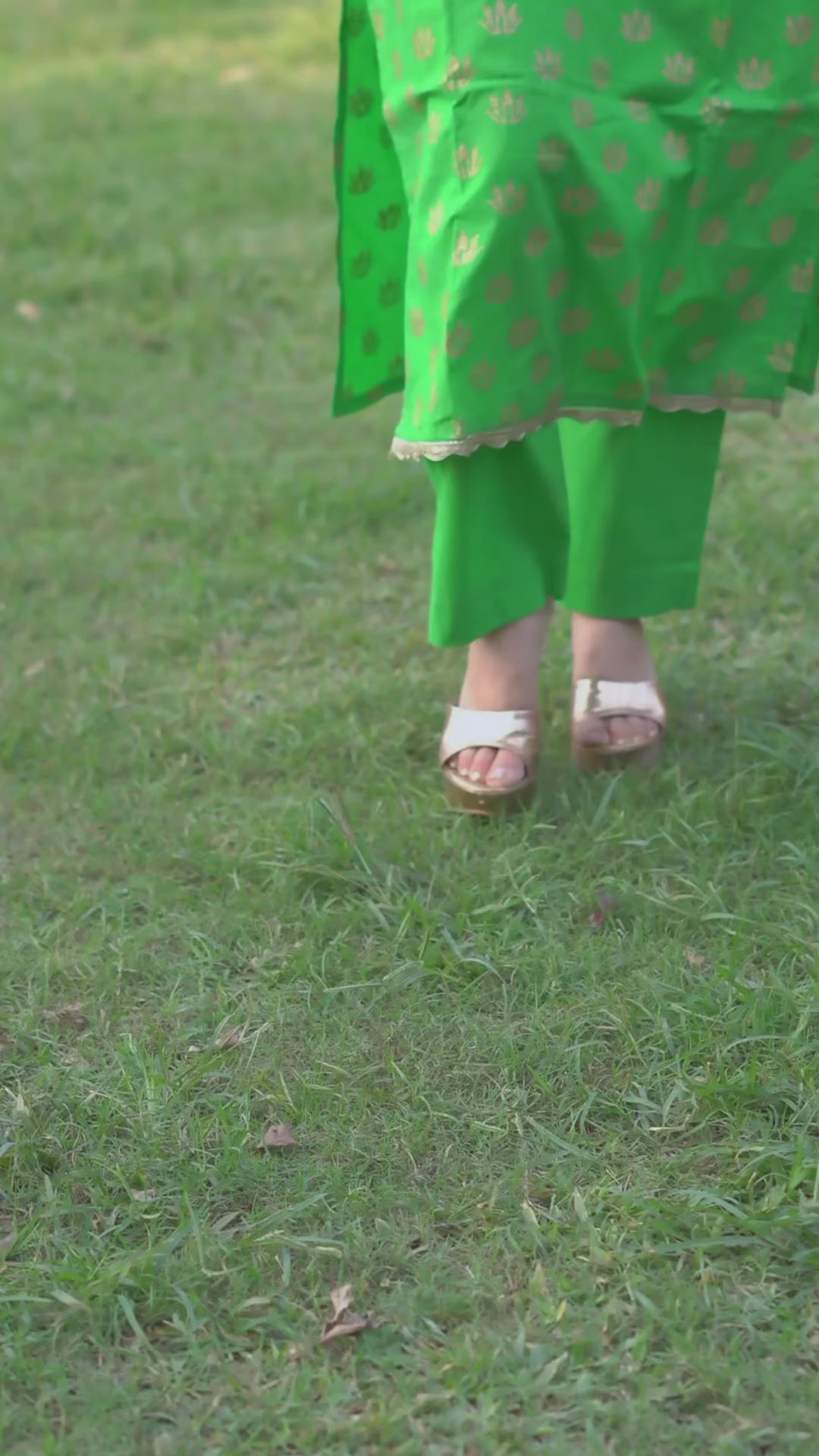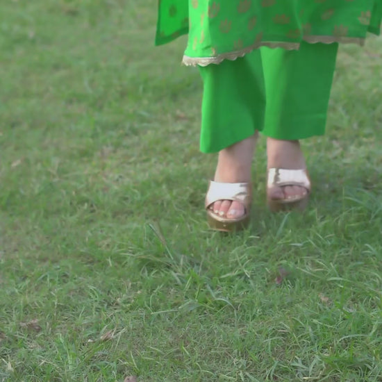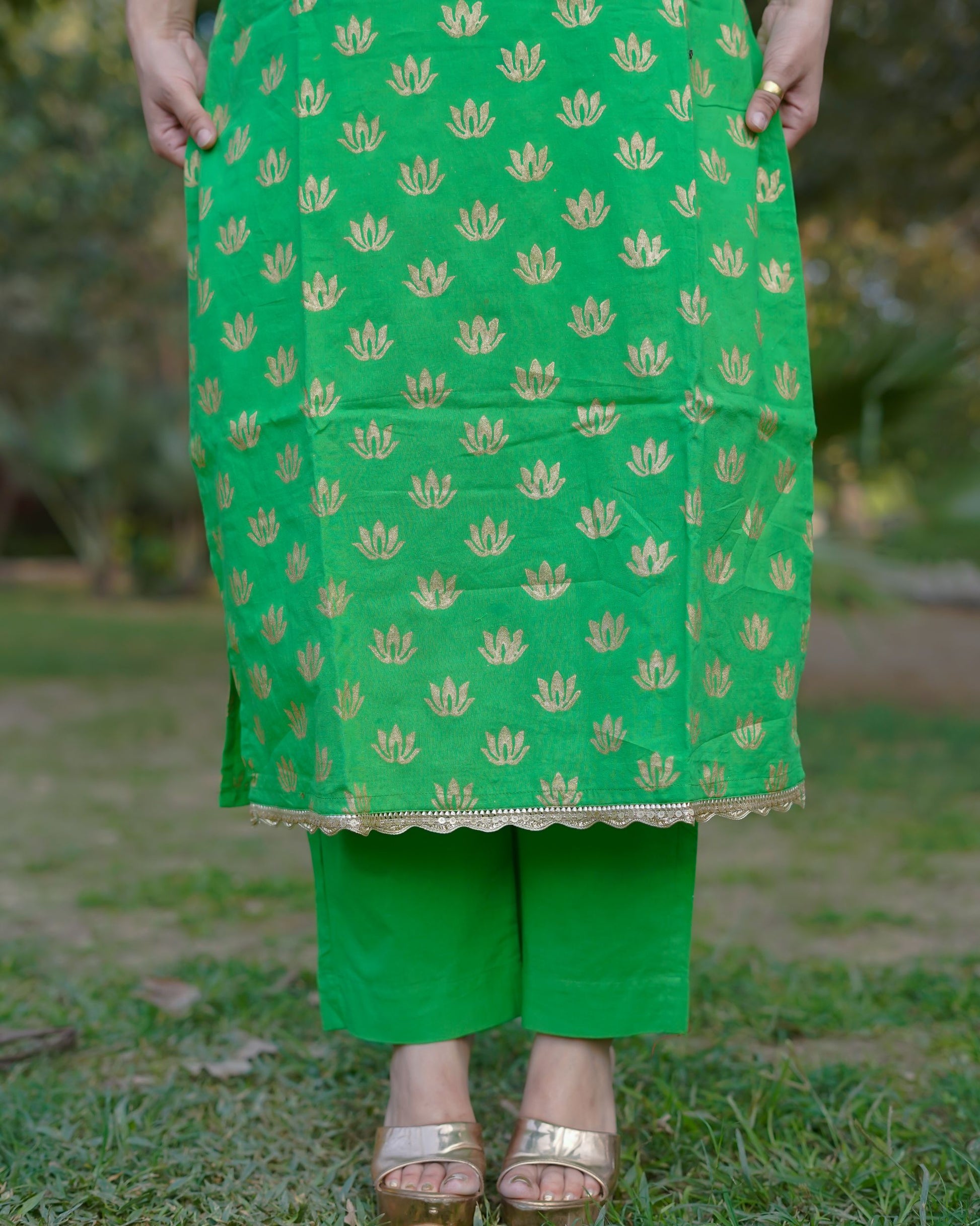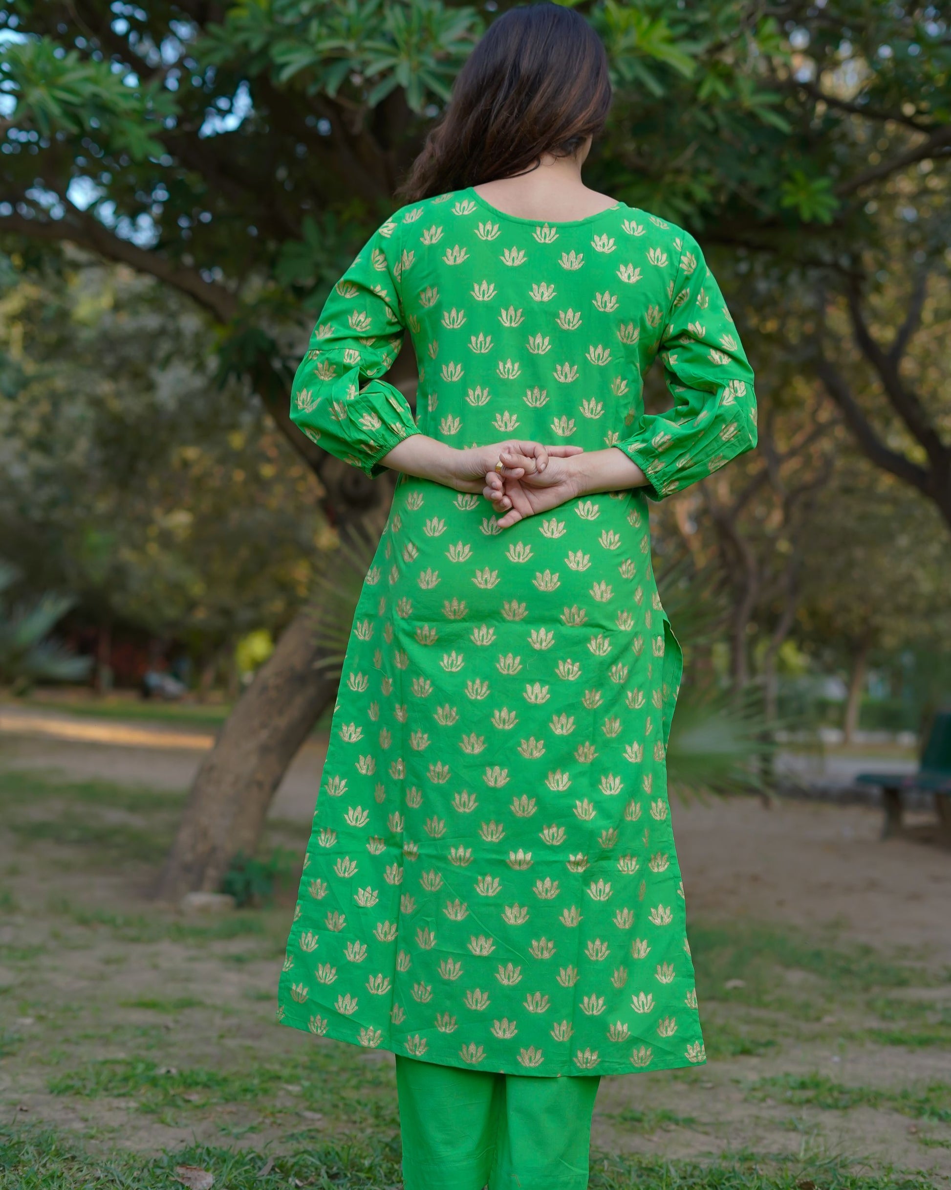 Made from 100% pure cotton, this vibrant green co-ord set features intricate handblock gold motifs that shimmer with subtle elegance. The kurta is designed with a graceful neckline and delicate golden detailing along the hem, paired with matching straight-fit pants for a coordinated and polished look.