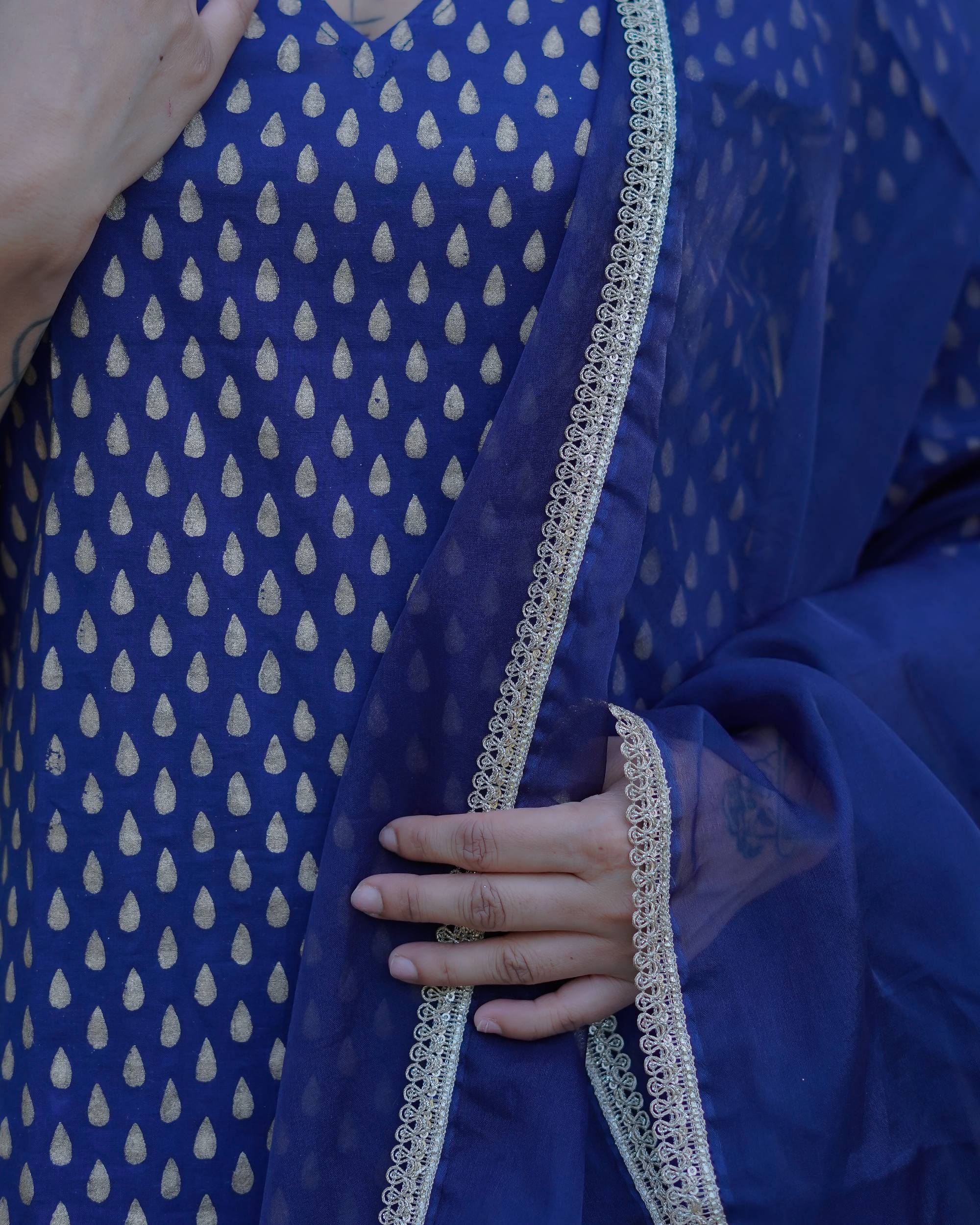 Aaravi – Midnight Gold Handblock Printed Cotton Suit Set with Organza Dupatta