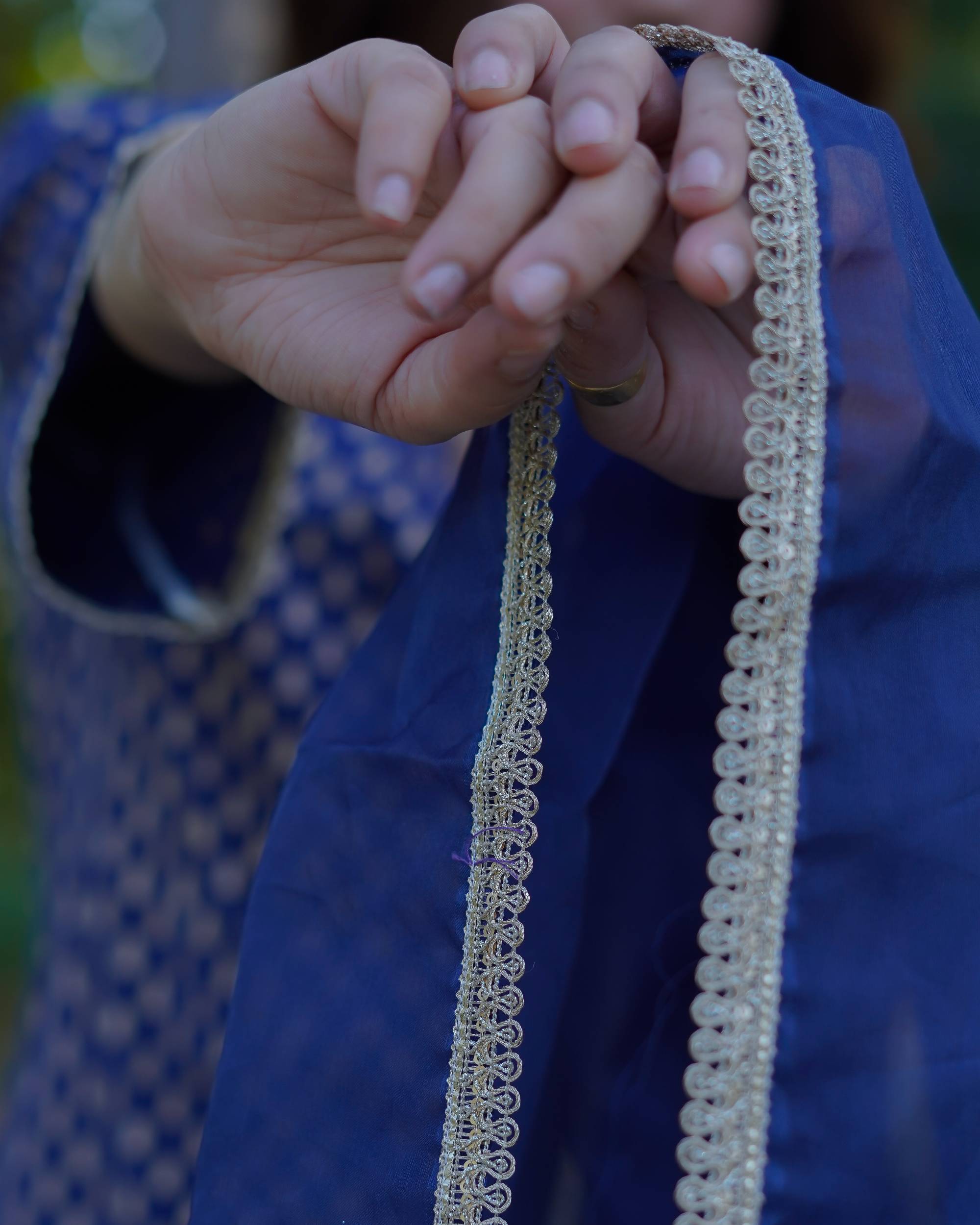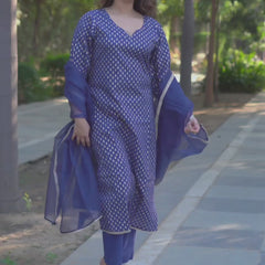 Step into timeless elegance with our Aaravi Midnight Gold Handblock Printed Cotton Suit Set — a captivating blend of tradition and luxury. Made from 100% pure cotton, this deep navy ensemble features exquisite handblock gold printing, creating a regal shimmer against the soft fabric.