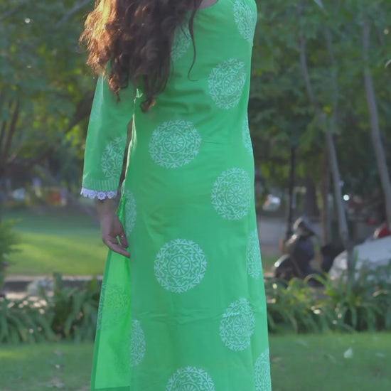 Step into serene elegance with our Gulmohar Glow Handblock Khari Print Cotton Co-ord Set, a graceful blend of artistry and modern charm. Crafted from pure, breathable cotton, this soothing green ensemble is adorned with intricate white khari handblock motifs, radiating subtle shimmer and timeless beauty.