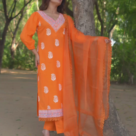 Radiate festive elegance with our Tara Marigold Glow Handblock Khari Printed Cotton Suit Set, handcrafted in soft pure cotton and adorned with intricate Khari handblock motifs. The warm marigold orange hue captures the charm of traditional Indian aesthetics, while the delicate shimmer of Khari print adds a graceful festive touch.